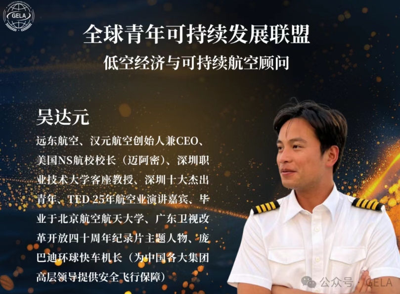 全球青年可持续发展联盟(Global ESG Leadership Association, GELA)正式宣布,中国最年轻公务机机长、深圳汉元航空创始人兼首席执行官吴达元先生正式加入全球青年可持续发展联盟,担任联盟低空经济与可持续航空顾问。